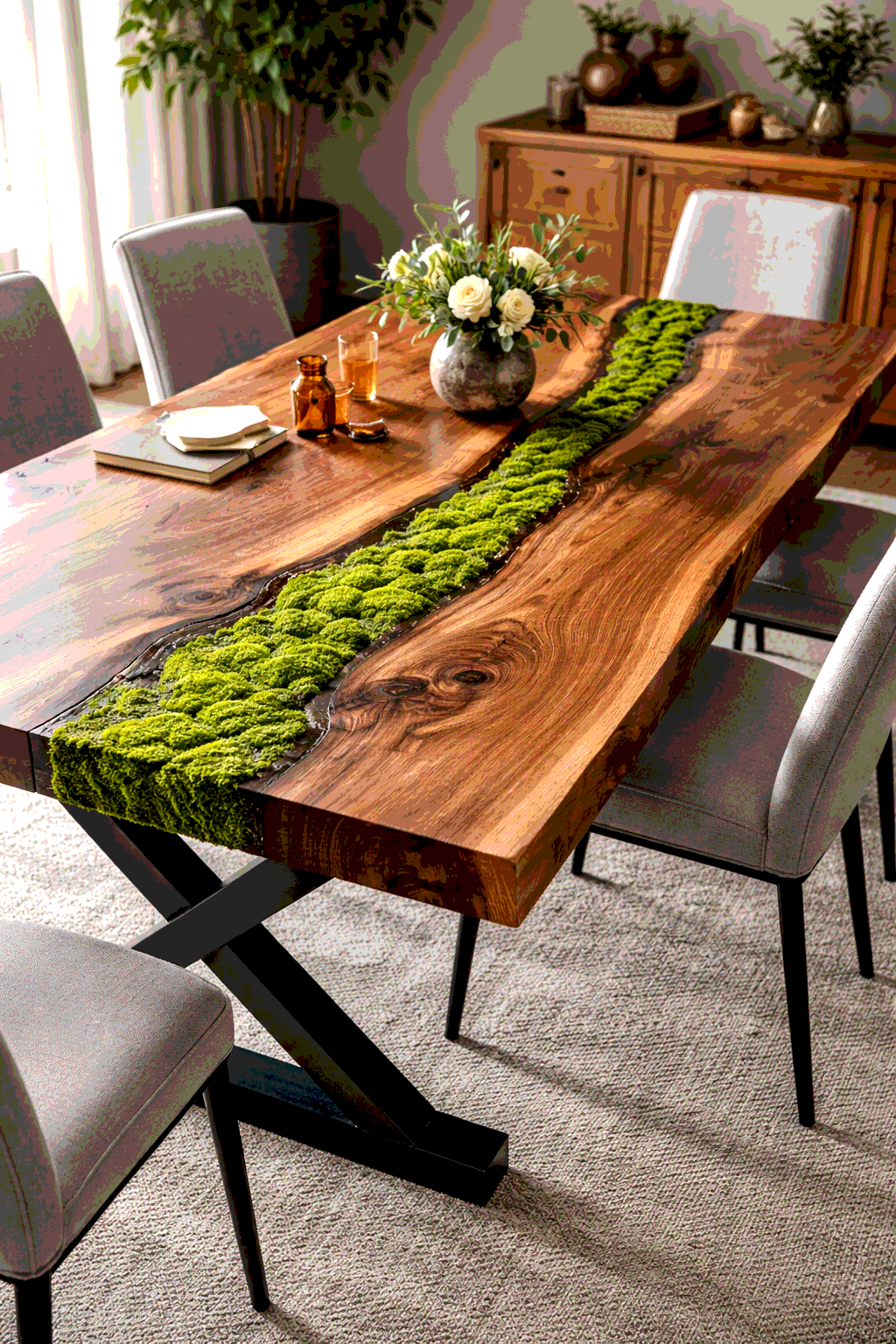 Это не просто дерево. Вставка из мха вызывает реакцию “вау” и делает стол разговорным объектом.
