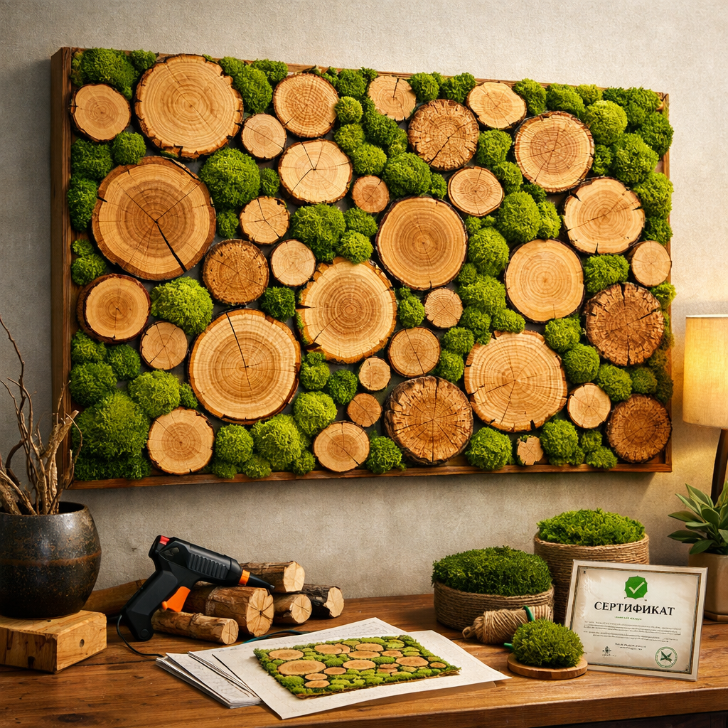 Панно из спилов дерева и стабилизированного мха - это интерьерная “природная композиция”, которая выглядит живой и объёмной, но не требует полива и обслуживания. Спилы дают тёплый рисунок дерева и ощущение ручной работы, а мох добавляет густую зелёную фактуру и глубину. В итоге получается акцент, который хочется рассматривать - и который отлично работает в кадре.