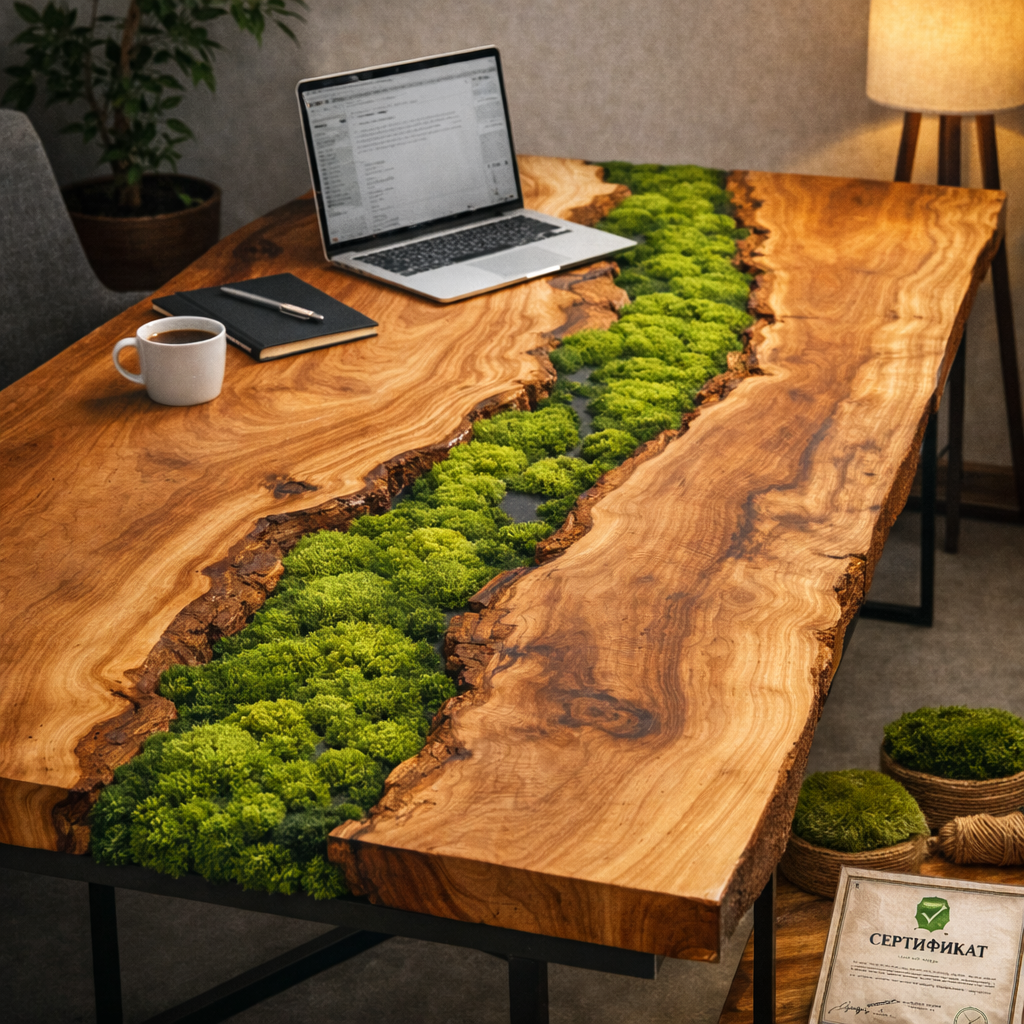 Столешница-слэб с моховой вставкой - это формат, который сразу делает пространство “дороже”. Он работает как предмет-герой: натуральное дерево даёт статус и тепло, а моховая вставка добавляет зелёный объём и эффект “природы внутри материала”. Такую столешницу выбирают для ресепшена, переговорной, кабинета, шоурума и частных интерьеров - там, где важно впечатление и хочется нестандартную деталь.