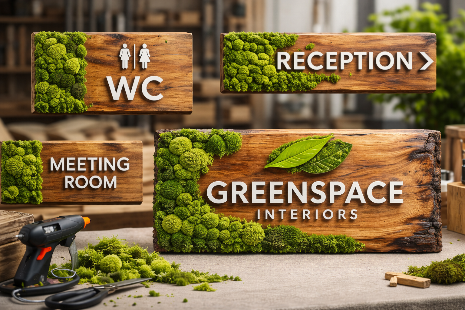 Таблички с мхом - это редкий случай, когда навигация становится частью дизайна. Вместо стандартных “офисных” указателей вы получаете тёплую, натуральную и очень фотогеничную деталь: дерево даёт статус, мох добавляет объём и “зелёный” вау-эффект. В итоге таблички работают не только на удобство, но и на впечатление - а это особенно важно для клиентских пространств.