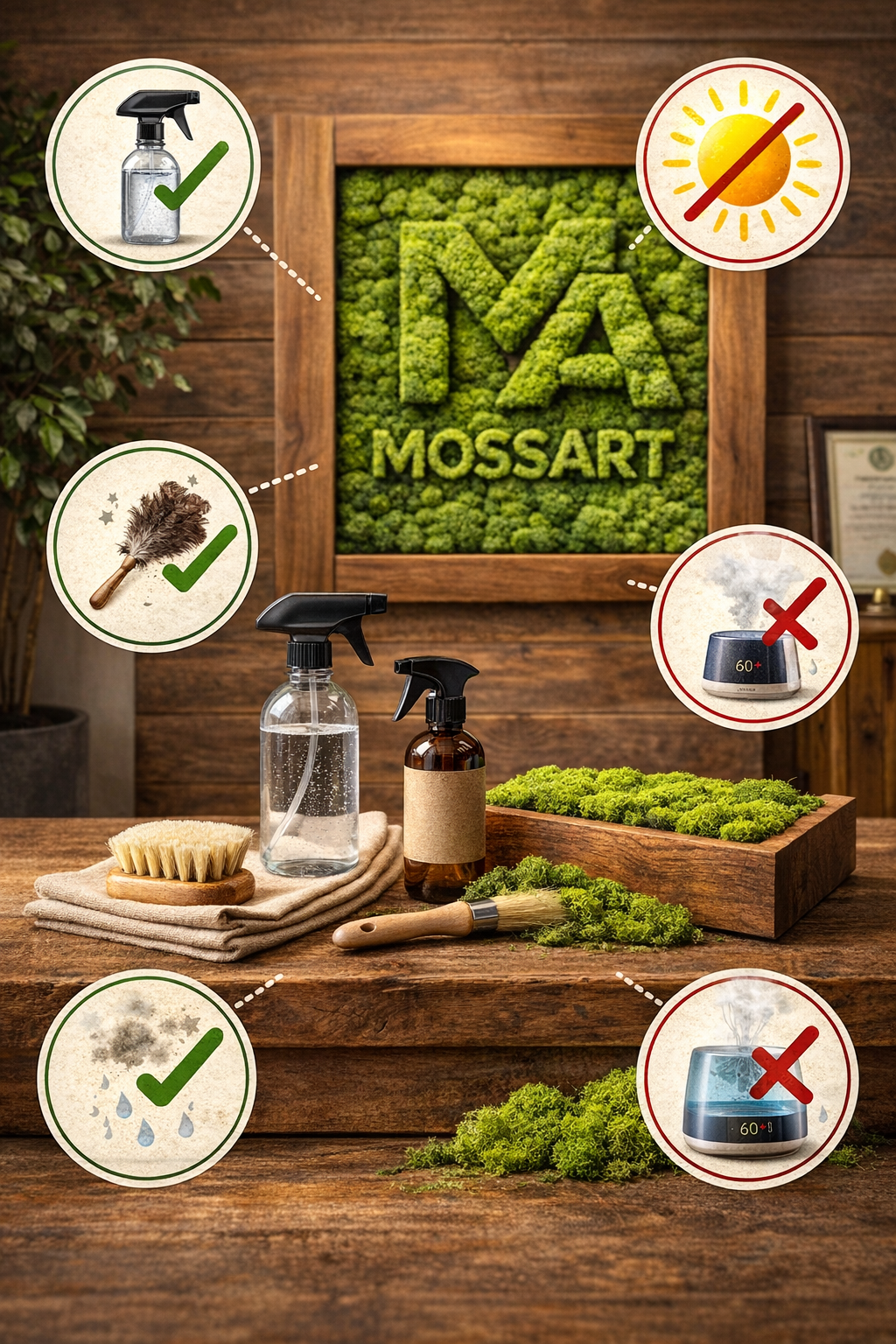 Изделия из дерева со стабилизированным мхом ценят за предсказуемость: они дают зелёный вау-эффект и не требуют полива. Но “без ухода” не означает “без правил”. Чтобы мох и дерево долго сохраняли премиальный вид, важно правильное размещение и аккуратная чистка.
