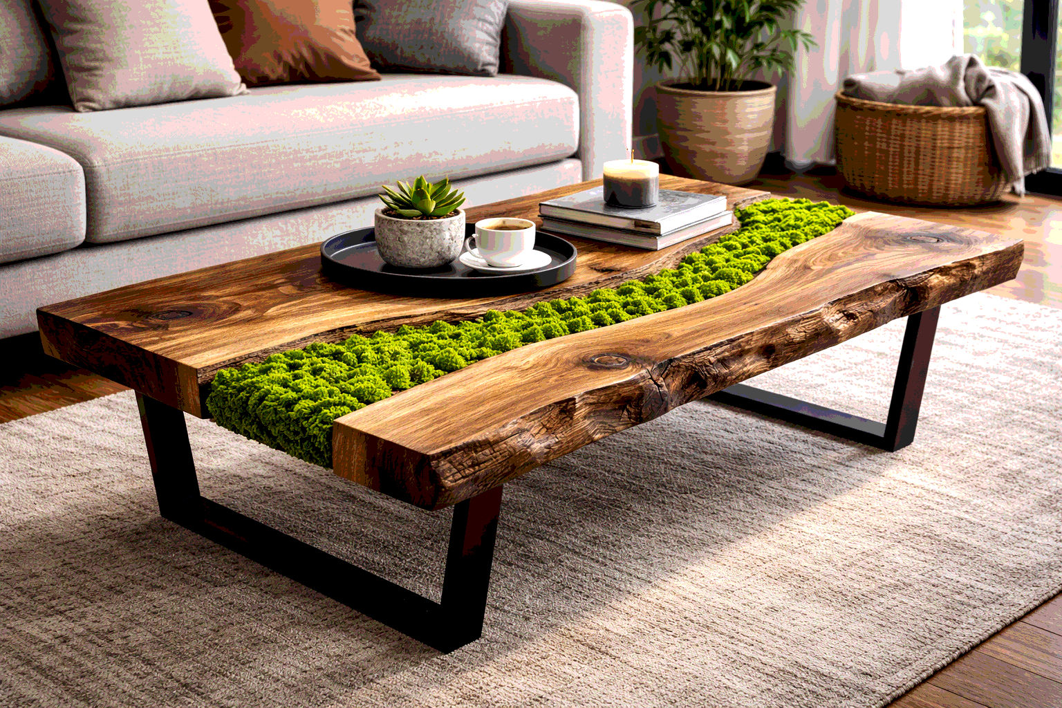 Журнальный стол из слэба с моховой вставкой - это тот самый акцент, который “делает интерьер”. Он небольшой по формату, но сильный по впечатлению: натуральное дерево даёт статус и тепло, а моховая вставка добавляет зелёный объём и эффект “природы внутри материала”. Столик отлично работает там, где люди задерживаются: в гостиной, зоне ожидания, переговорной, в шоуруме или на ресепшене.
